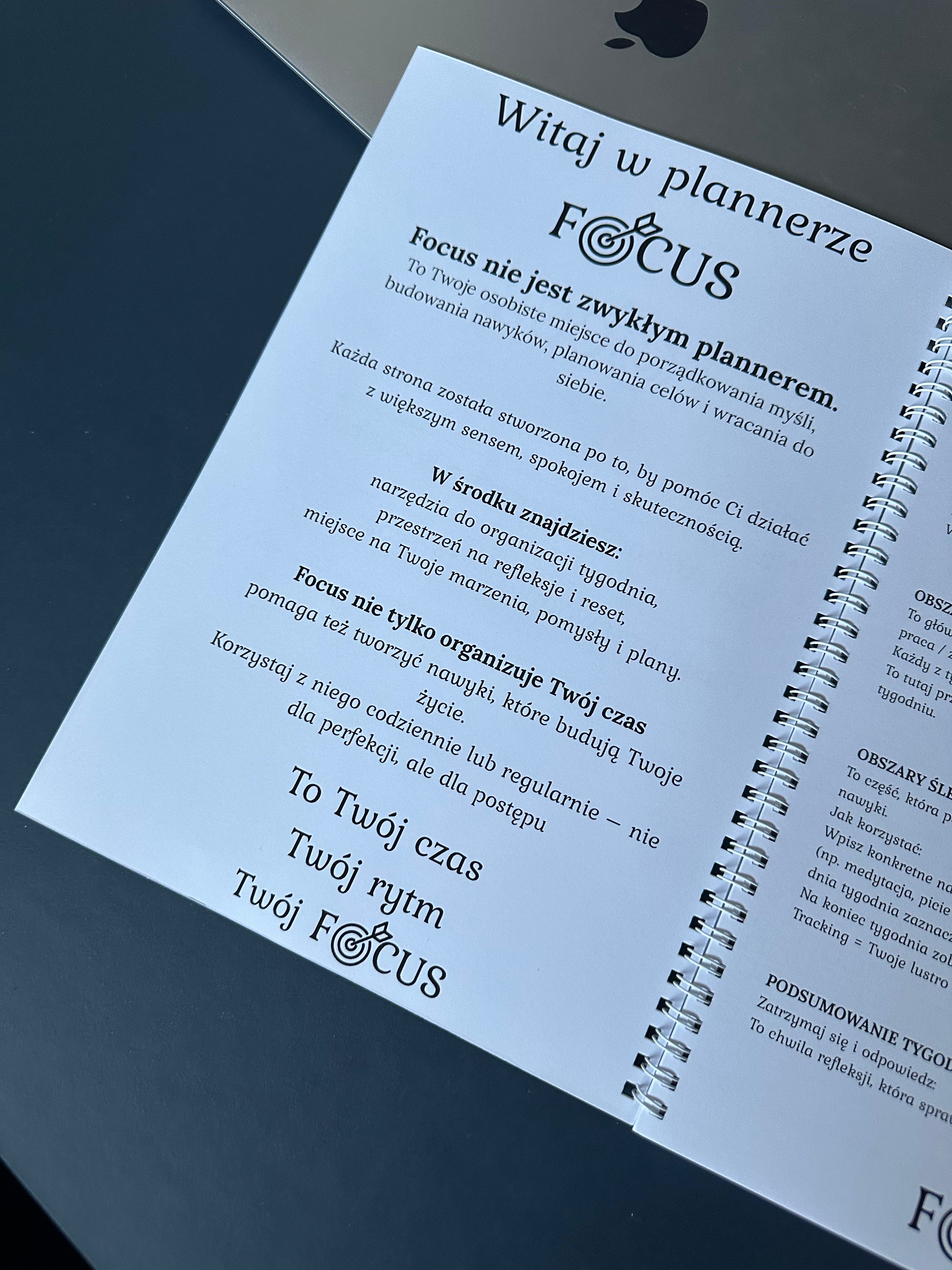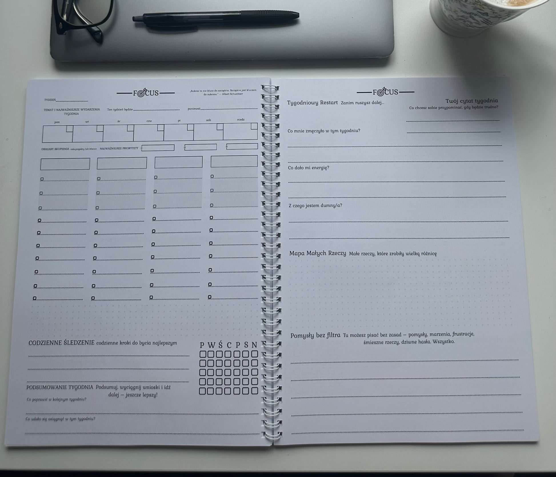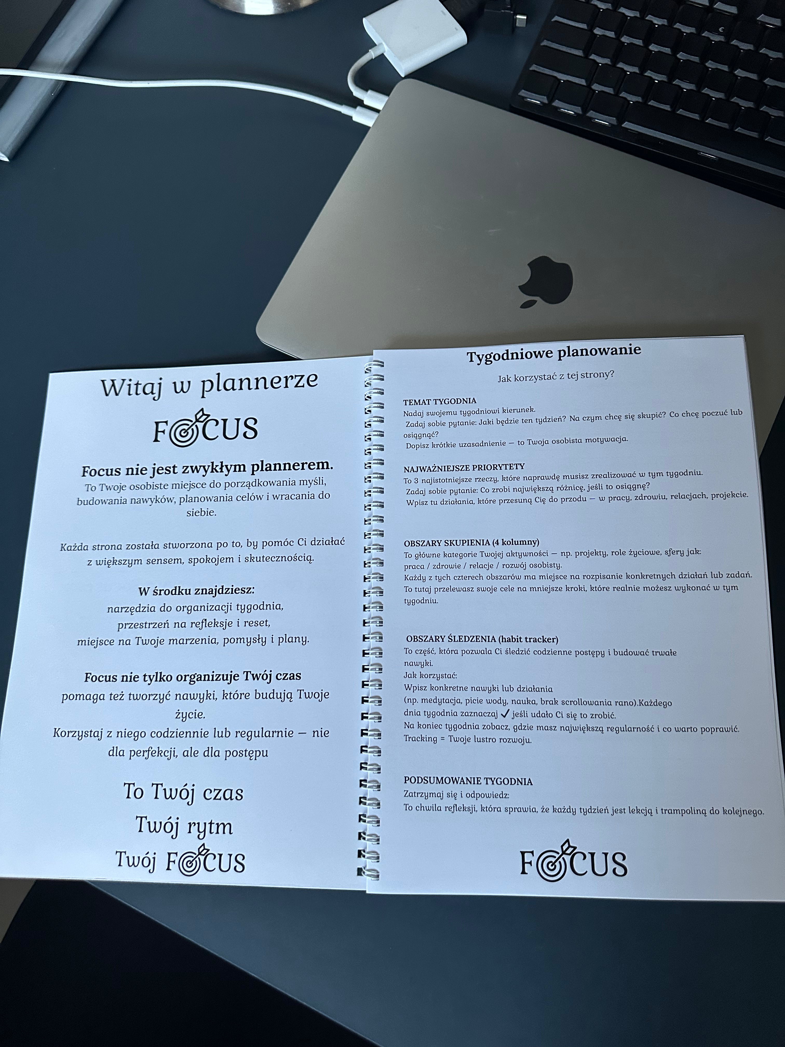 FOCUS to kompletny system: od tygodniowego planowania, przez codzienne nawyki, aż po podsumowanie, które gwarantuje, że będziesz ciągle się rozwijać.